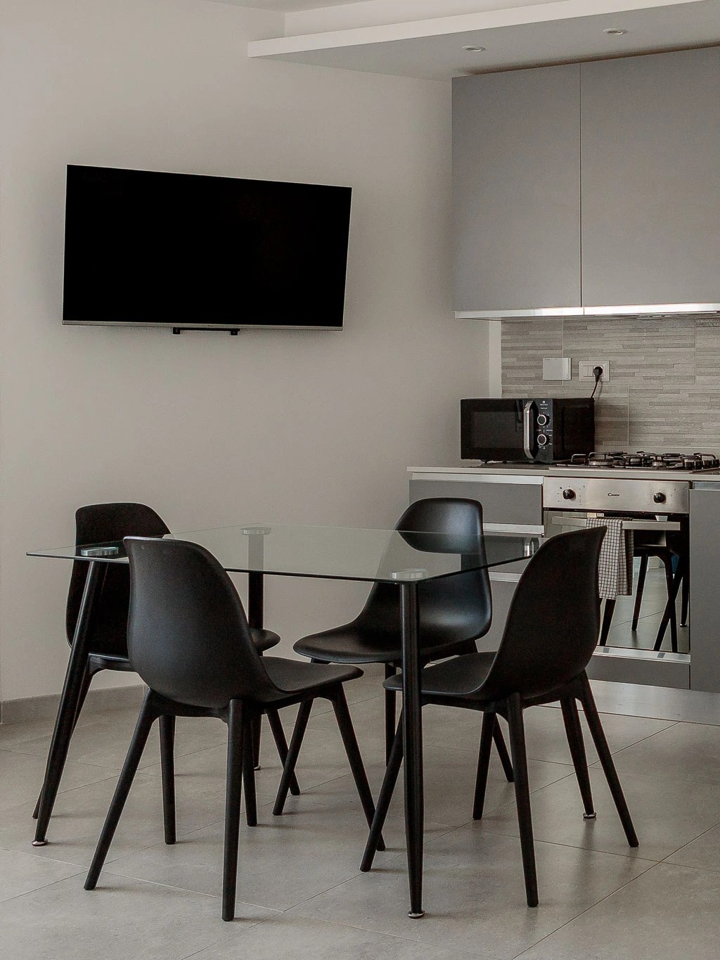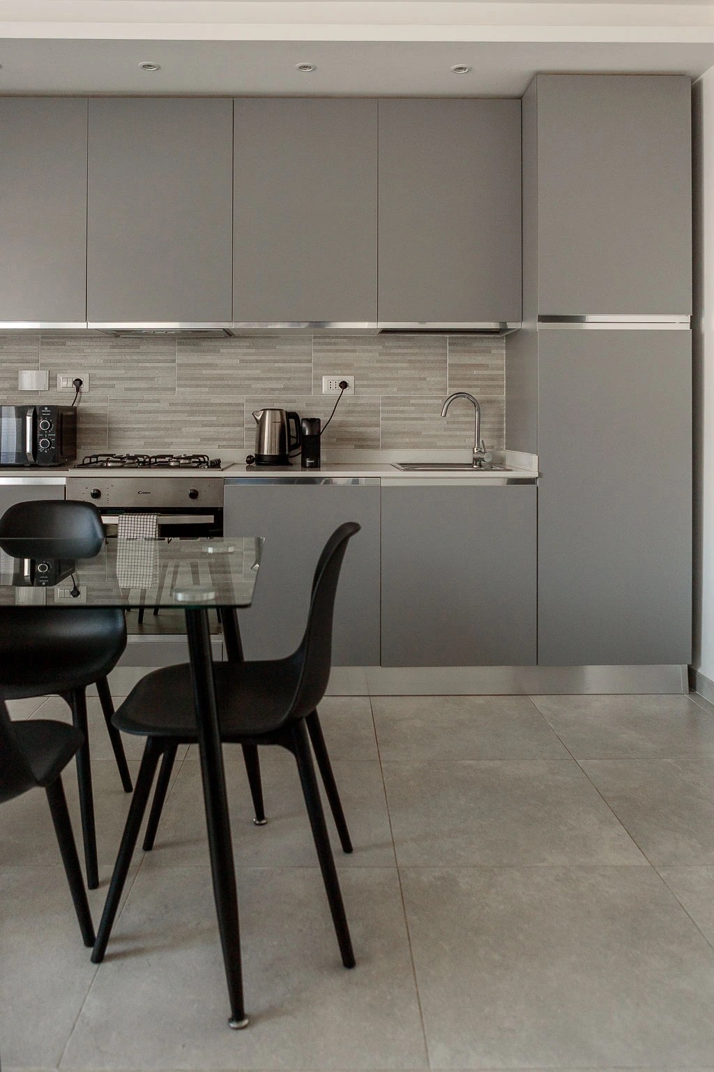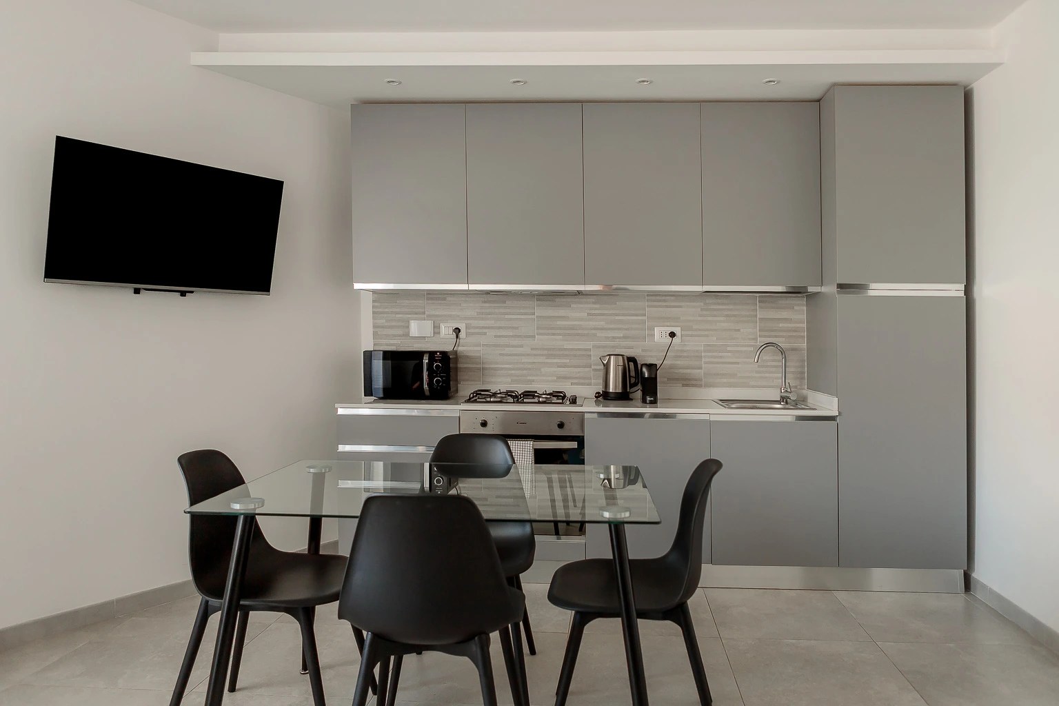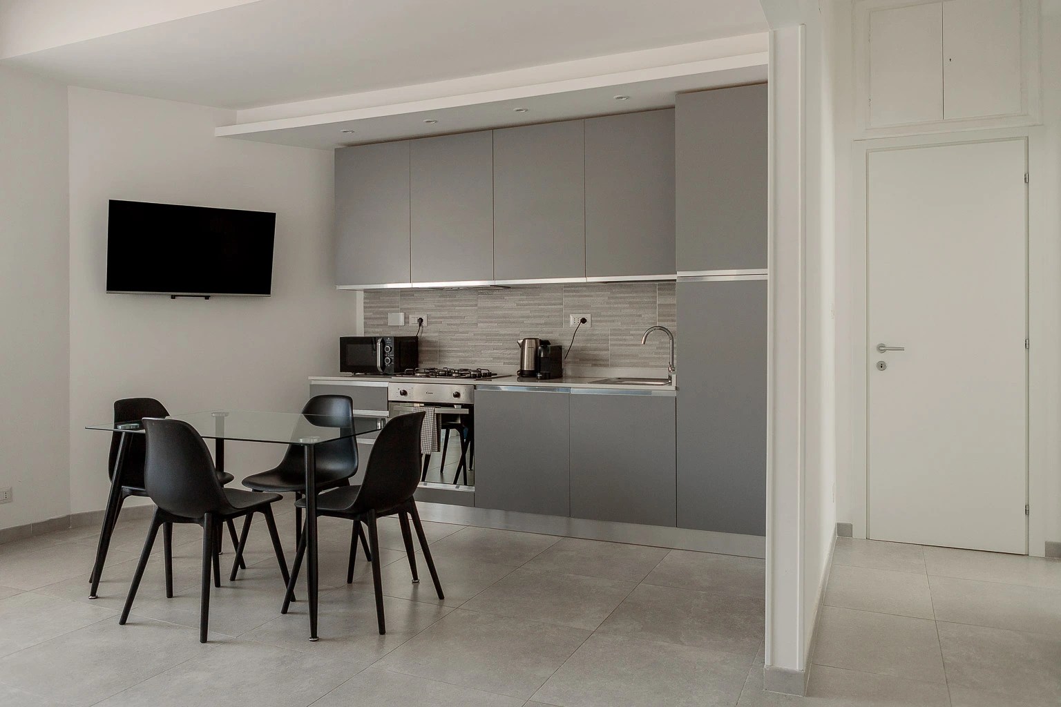 - Cucina attrezzata con utensili, piatti, bicchieri, pentole, microonde, forno, piastra a induzione, lavastoviglie, lavatrice, macchina del caffè e bollitore con capsule del caffè.